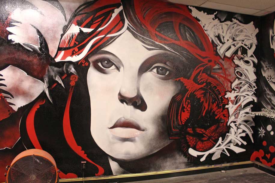 I met Jaime Galindo (Love Oakland Group) from an incident where my friend's car was about to be broken into and Jaime and his friends made sure that didn't happen and my friend and Jaime connected. When Jaime told my friend what he was about and what he's doing to the neighborhood to put murals onto local downtown business to curve the vandalism in the area, my friend also mentioned me as a person in the community who is an artist that produces spray can art murals. We connected afterwards and I was invited to one of their block parties and after a mural on top of the local Fire Fighters Union Building, I decided to help them out as much as I can. A few months had passed and Jaime approached me about doing the inside of his gallery. I pulled together a couple of local artists and proceeded to produce work that you see here on this page. This is my first art piece/section on the wall. My friend Blaze aka Picasso did the right side design and hair on this lady's face. This whole project was a concept of mine using only Red, Black and White spray paint. The artists that were involved were Bam TWS, Nate1MPC, Blaze aka Picasso TWS, East3 and Kraze from Hawaii and myself as the lead artist. Contact me for inquiries.