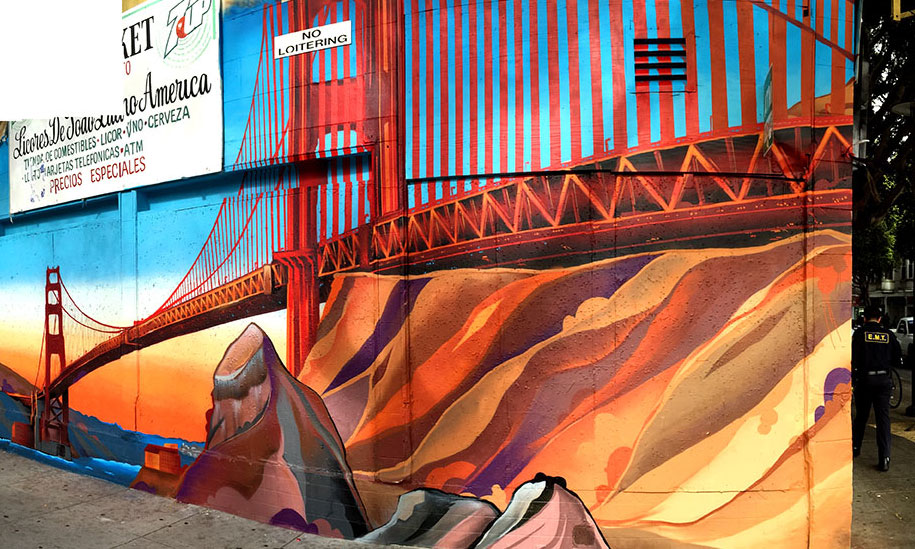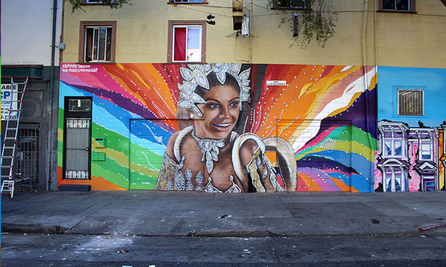 The corner store had some vandalism issues on their wall for several years. Each and every time a vandal tagged their corner wall, the owners were fined by the city to cover it up. So instead of paying almost every week to erase graffiti on their walls, they got in contact with a local community Art Gallery owner (Mission Art 415) who have access to many of the local artists and had me commission a mural the size of 14' x 120' feet. It took me almost a month because I was also notified by the City of San Francisco to join their Fire Department (A dream of mine since 1985).