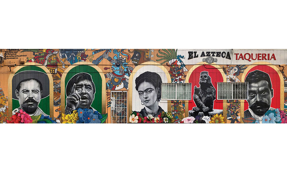 When I was finish up on the Dharma mural and man who owned a local Taqueria on 3rd Street wanted a mural done on his wall/business. Once we met up, we discussed his likes and dislikes on the possiblities on the potential mural. I went home and came up with a photoshop digital sketch superimposed onto the photo of his business with the empty wall. The final outcome looks very similar to the design work in did in that first computer format. From left to right is: Francisco Pancho Villa, Cesar Chavez, Frida Kahlo, Xochipilli and Emiliano Zapata Salazar.