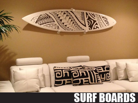I was hired by a client who had a tribal pattern on his shoulder and arm and I created a version of his tirbal tattoo and placed by version of the design onto one of his surfboards. San Jose, Ca.